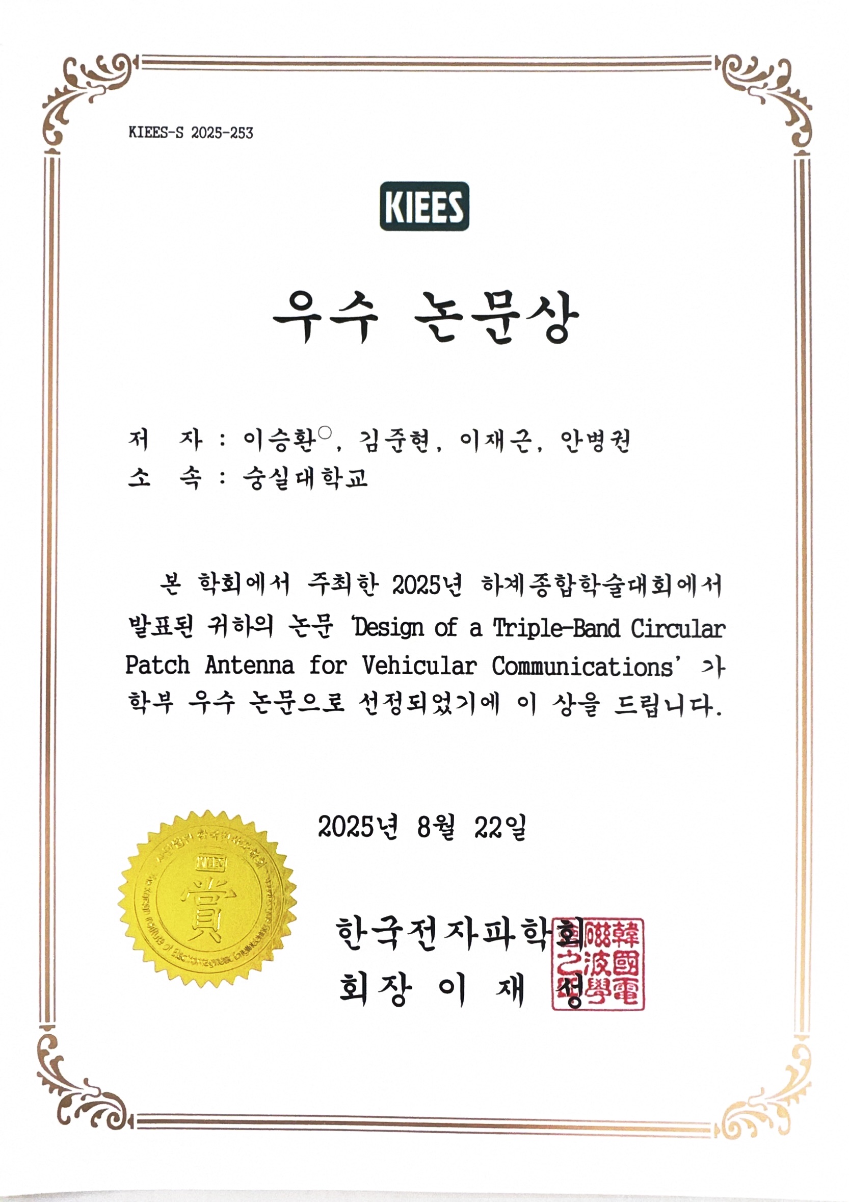 이승환, 김준현, 이재근, 안병권, "Design of a Triple-Band Circular Patch Antenna for Vehicular Communications"
