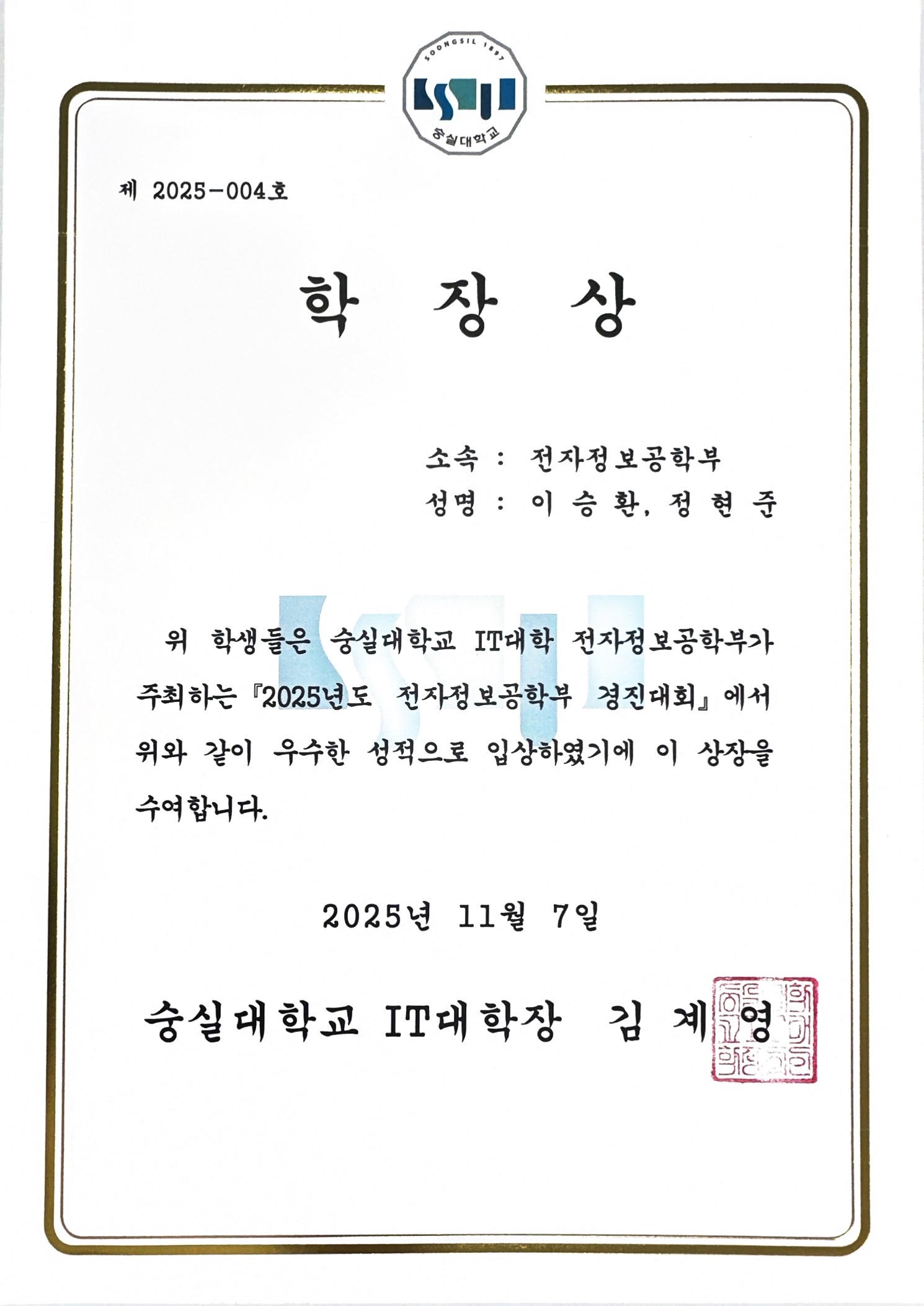 학장상 - 이승환, 정현준, "Triple-Band Circular Patch Antenna for Vehicle Communication"